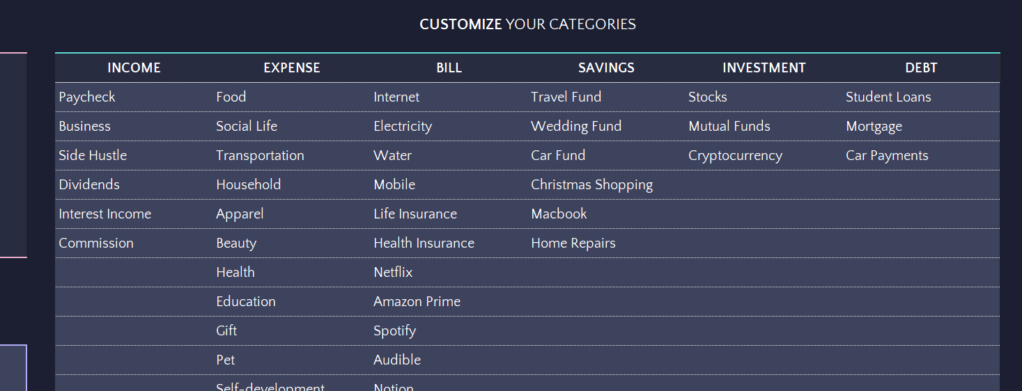 Flexible Structure: Tailor expense and income categories to suit personal or business needs.